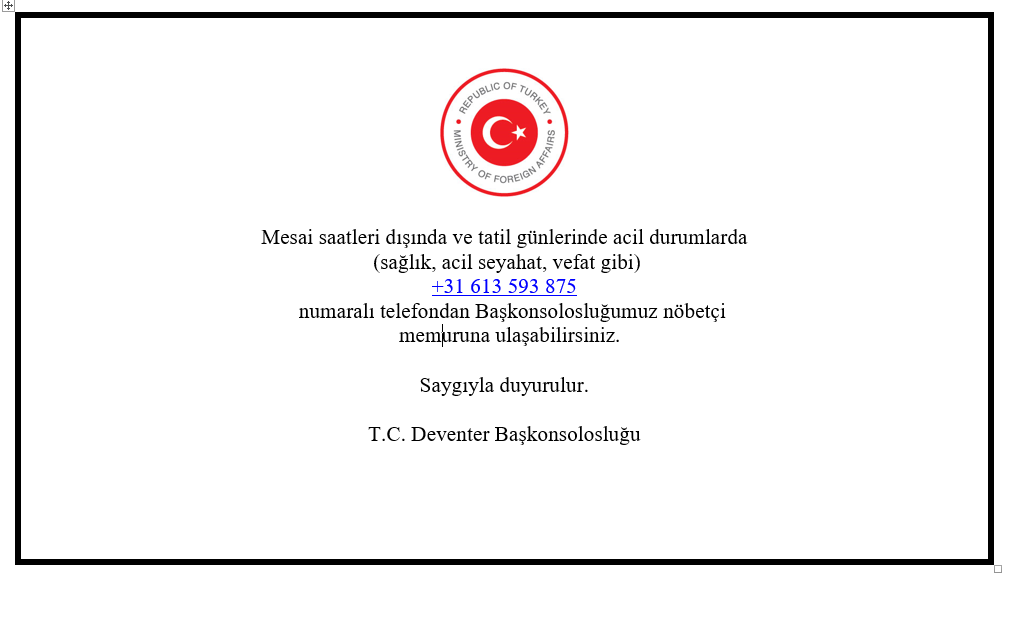 Mesai saatleri dışında ve tatil günlerinde acil durumlarda (sağlık, acil seyahat, vefat gibi) +31 613 593 875 numaralı telefondan Başkonsolosluğumuz nöbetçi memuruna ulaşabilirsiniz.